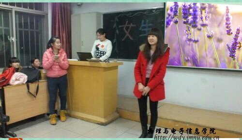 本网快讯 2015年3月7日晚,我院学生会于田楼128教室为我院女生举办女生节庆祝活动。据悉,同学们在主持人的带领下,进行了心有灵犀、萝卜蹲等经典游戏,并引领在场同学进行了以“我的梦想”为主题的座谈会,最后同学们在游戏的欢声笑语与激烈的讨论中共同度过了一个美好的夜晚。与此同时,此次活动的目的旨于为广大女生营造轻松欢愉的节日气氛,创建快乐向上的校园环境。