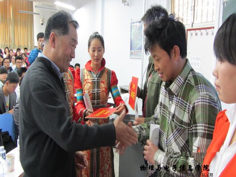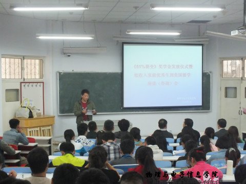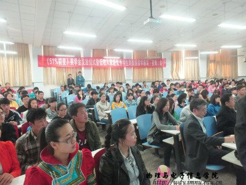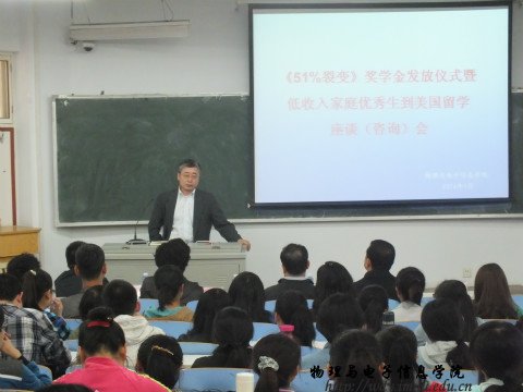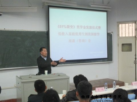 2014年5月8日下午,我院在田楼七共举行了《51%裂变》奖学金发放仪式暨低收入家庭优秀生美国留学座谈会。出席此次活动的有《51%裂变》奖助学基金发起人单明先生、我校校友会常务副秘书长陈佩文老师及我院党总支书记阿梅老师、特古斯院长;党总支副书记何小龙主持了座谈会,团总支萨其尔老师、学工办宋志强老师及各班班主任老师、同学近两百人参加了座谈会。