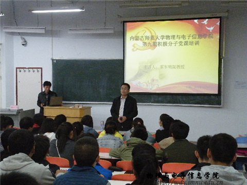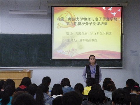 为提高入党积极分子的政治理论素养,为进一步提高同学们的思想觉悟,端正入党动机和态度,加强对中国共产党的基本知识的学习和掌握,2014年4月3日下午,我院在田楼十共举行了党史知识的培训,法政学院副教授董军明应邀担任主讲人,党总支副书记何小龙、团总支萨其尔出席讲座。