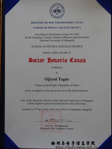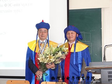 8月26日,我校物理与电子信息学院特古斯教授应邀在蒙古国国立大学,作题为《EXAFS and Neutron Diffraction studies on MnFe(P,Si) Compounds 》的报告,并接受蒙古国国立大学颁发的名誉博士证书。蒙古国立大学成立于1942年,系蒙古国最高学府,是蒙古国社会科学、自然科学研究重要中心之一。