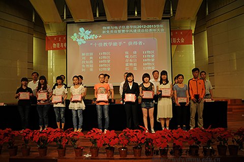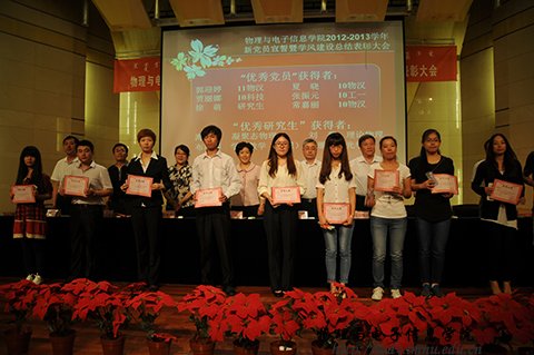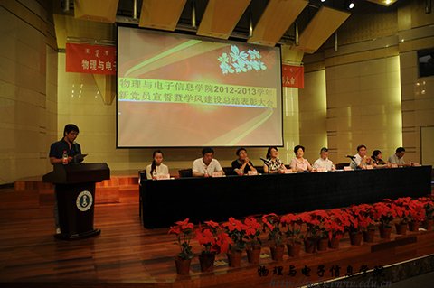 大会首先由阿梅老师致辞,对新党员提出两点建议,一是要提高自身组织纪律性,发挥先锋模范作用,促进学风建设;二是要加强学习实践,做一名合格党员,不断提高为同学服务的本领和能力。之后大会进行了庄严的新党员宣誓,由学工办宋志强老师带领47名党员在鲜红的党旗下宣读了入党誓词。紧接着何小龙副书记宣读了表彰决定。与会嘉宾为学风建设方面取得优异成绩的先进集体及个人进行了颁奖。获奖学生代表09级物理汉班王鑫和11级物理汉班郭迎婷分别进行发言,感谢学院及老师们对学生的辛勤付出,决心继续发扬优良学风,再接再厉,再创辉煌。
