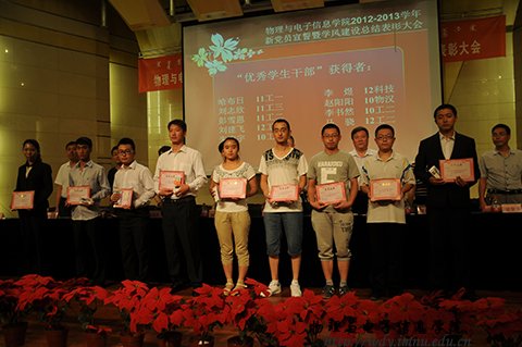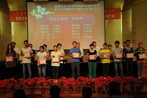 2013年7月1日,我院在逸夫楼音乐厅隆重召开2012—2013学年度新党员宣誓暨学风建设总结表彰大会。参加大会的领导有:党总支书记阿梅老师、院长特古斯教授、副院长吉日嘎拉教授、副院长刘美玲老师、党总支副书记何小龙老师、物理系主任张敏老师、电子系主任梁学军老师、实践创新部主任曹永军老师以及学院各班级班主任和任课老师。大会由团总支萨其尔主持。