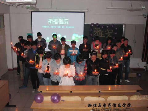 习近平同志指出:“实现中华民族伟大复兴,就是中华民族近代以来最伟大的梦想”。作为新一代大学生,如何响应党的号召,积极投身于中国特色社会主义伟大事业中去实现中国梦?就让我们从力所能及的事情做起,在5月8日,我院大一学生在晚上7点半开始有组织性的为雅安祈福,为四川的同胞们祈祷。