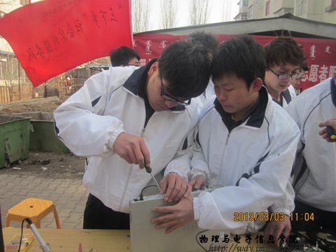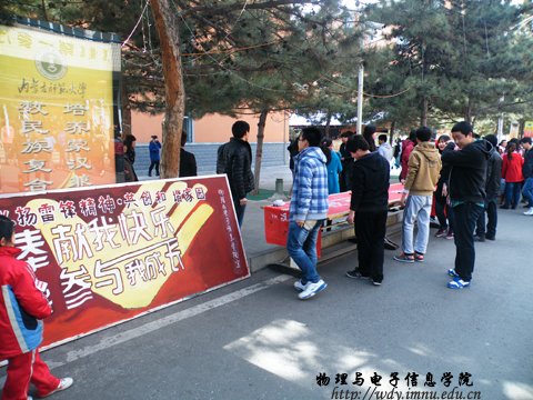 在活动期间,33日,我院科技协会深入师大家属院,开展了义务维修活动,受到了社区居民的热烈欢迎,对参加维修活动同学的水平也赞叹有加。第二日,我院在校园内外开展了义务清洁活动。帮助交警打扫警卫厅周围的环境,为减轻交警的工作压力提供很大的帮助。在雷锋活动日当天,我院在餐厅门前举办“学习雷锋,动员签字”活动。将雷锋精神落实到每位师生的学习、工作和生活中,有效建立学雷锋的长效机制,为营造文明和谐的校园贡献自己的一份力量。