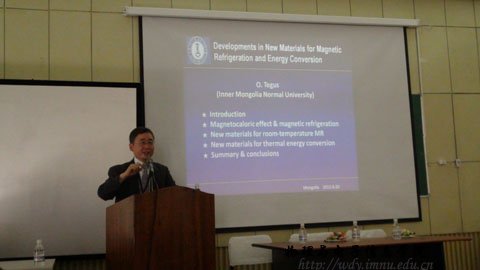 2012年8月20日,我院特古斯教授、赵凤岐教授等一行参加在乌兰巴托举行的国际材料科学会议。特古斯教授在会议上作了关于磁制冷材料方面的学术报告,并与各国学者就有关问题进行交流。同时参观访问蒙古国立大学,与国立大学校长进行座谈。双方都表示内蒙古师范大学和国立大学一直保持了很好的合作关系,希望进一步加强双方师生交流,加深科研领域合作。