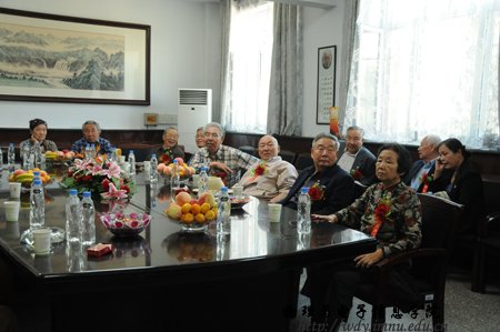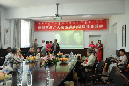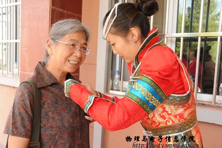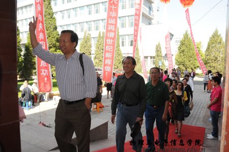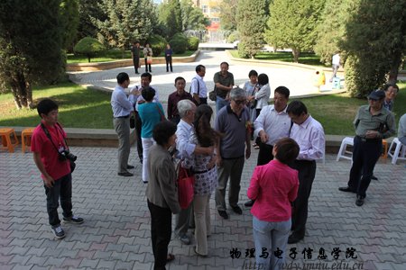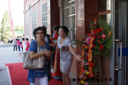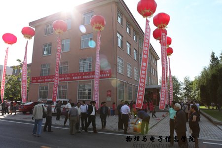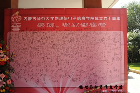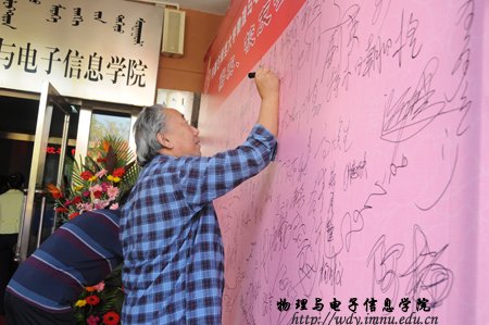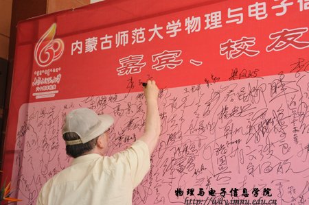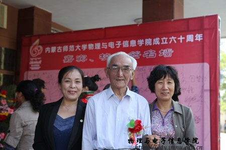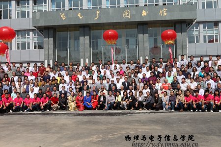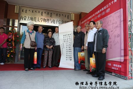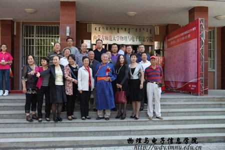经过全院师生紧张而充分的前期准备工作,9月8日上午,全院师生热情接待了400余名来自四面八方的各界校友;上午各位校友在志愿者引领下参观了学院教学科研成就展并与老教师们进行了亲切的交谈,11时,全体校友在图书馆前合影留念,中午12时,全体人员在海航大酒店二楼宴会厅隆重举行了庆祝内蒙古师范大学物理与电子信息学院60周年院庆典礼和午宴,庆典由党总支书阿梅主持,阿书记代表学院对恭贺单位和个人表达了谢意,特古斯院长回顾了作为自治区建置最早的一所院系60年取得的成就,感谢各位前辈和各届校友对学院发展过程中给予的各方面的支持也展望了学院未来发展的远景;