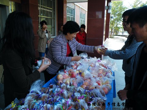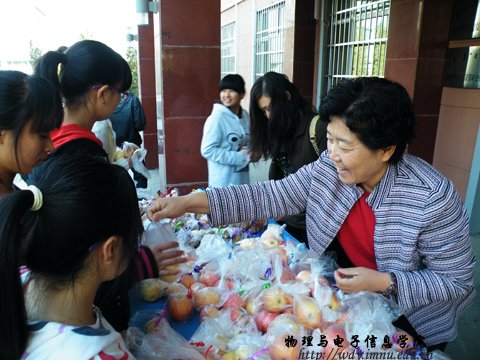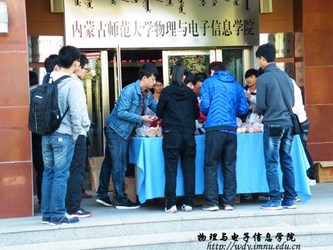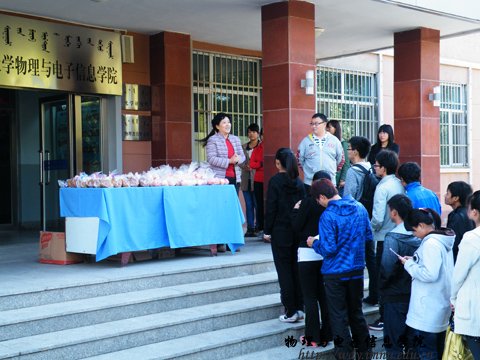 2012年9月30日,在中秋佳节与国庆节来临之际,我院党总支书记阿梅老师、学工办呼和老师、侯爱玲老师代表学院全体领导、教师在物理与电子信息学院门前,对未回家过节的学生进行了慰问。