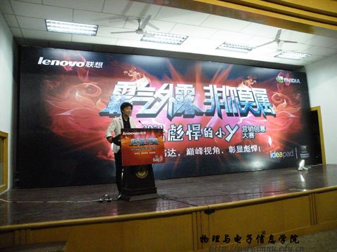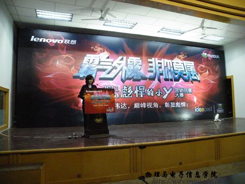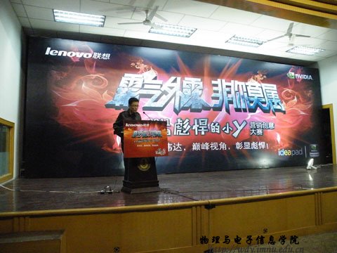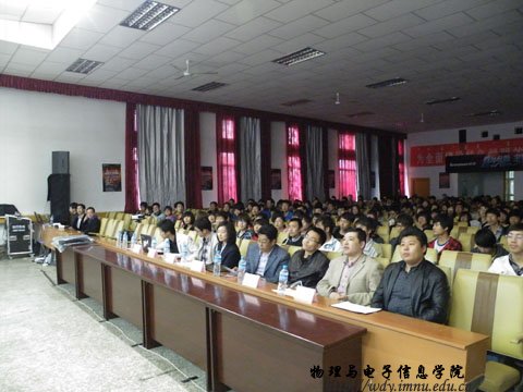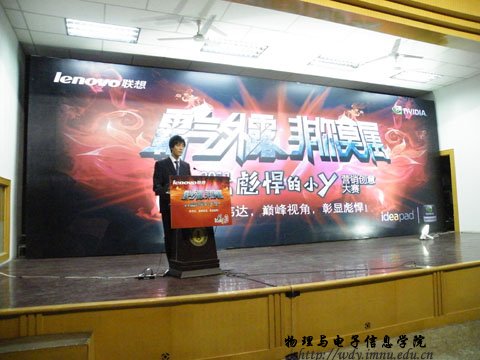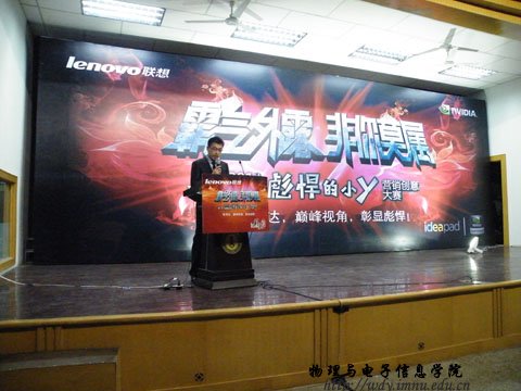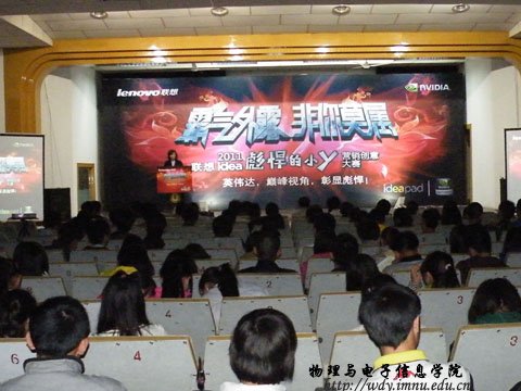 4月26日19:00联想集团在生物楼报告厅召开“霸气外露,非你莫属”--2011联想idear彪悍的小y营销创意大赛校园宣讲会。本次宣讲会由内蒙古师范大学联想idear精英汇第一届会长我院08工程4班赵鹏同学主持。参加本次宣讲会的嘉宾、领导有:联想集团晋蒙分区消费业务处业务经理王翠敏,联想集团晋蒙分区商用业务处业务经理任胜龙,联想集团晋蒙分区消费业务处品牌经理于磊,物理与电子信息学院党总支副书记兼副院长辛智俊老师,物理与电子信息学院团总支书记何小龙老师,盛乐校区管委会张伟老师。