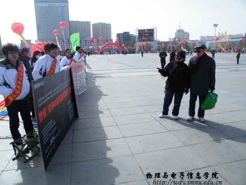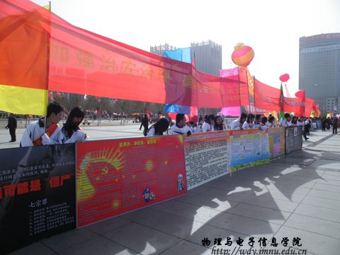 3月18日,由校保卫处代表市教育厅组织的社会治安综合治理宣传在新华广场举行。此次活动的参与者全部为我院09、10级同学。我院设计的展板被选中并展出。活动期间同学通过展板绘声绘色的为市民讲解安全知识,的到广大市民的好评,纷纷夸赞当今大学生的素质高、知识丰富。