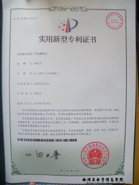 2009年6月,我院07工程2班杨桂全的科技作品“导线测断笔”在学校、学院的支持下申请了中国国家专利,2010年3月10日在中国国家专利网上公布,专利号:ZL200920157969.4。