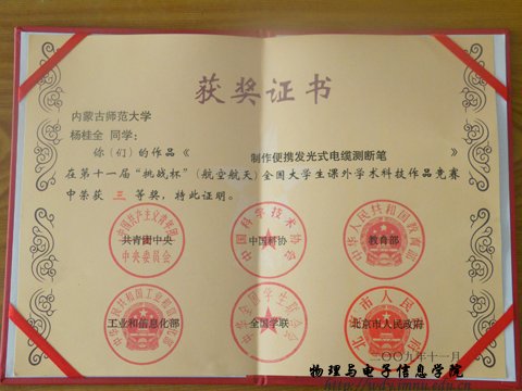 2009年10月28日,全国第十一届“挑战杯”大学生课外学术科技作品竞赛荣获三等奖。