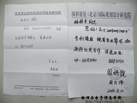 2010年3月15日,国科精锐(北京)国际规划设计研究院及北京华太应用科学技术研究院分别受企业委托就专利转让请求问题发来信函,现与国科精锐(北京)正与企业就专利转让进行洽谈。