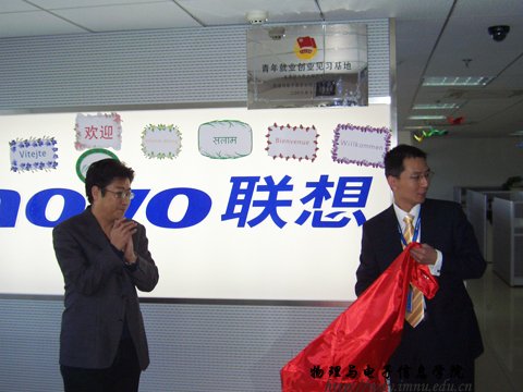 物理与电子信息学院副书记兼副院长辛智俊、学工办主任张伟以及联想就业创业联盟会长赵鹏同学参加了挂牌仪式。物理与电子信息学院副书记兼副院长辛智俊与联想(北京)有限公司晋蒙分区消费业务处渠道经理高旭为基地揭牌。