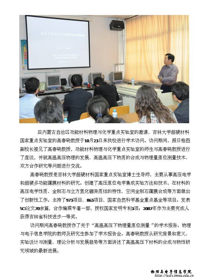 吉林大学超硬材料国家重点实验室高春晓教授来我校进行学术交流
