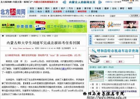 新报讯(记者 李 元) 2008年11月6日,本报刊发消息,对内蒙古师范大学物理与电子信息学院2006级凝聚态专业硕士研究生刘建军,赴北极参加科考任务进行了报道。记者3日了解到,刘建军已经圆满完成科考任务回国,并于6月2日晚在内蒙古师范大学信息楼做了一场题为《北极科考心得体会与极光简介》的讲座。