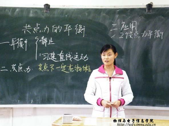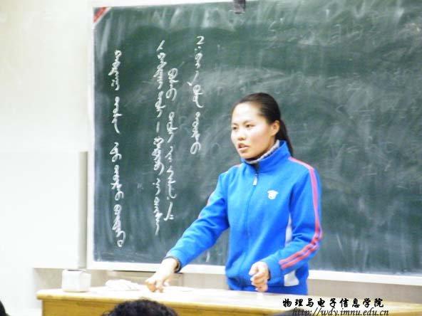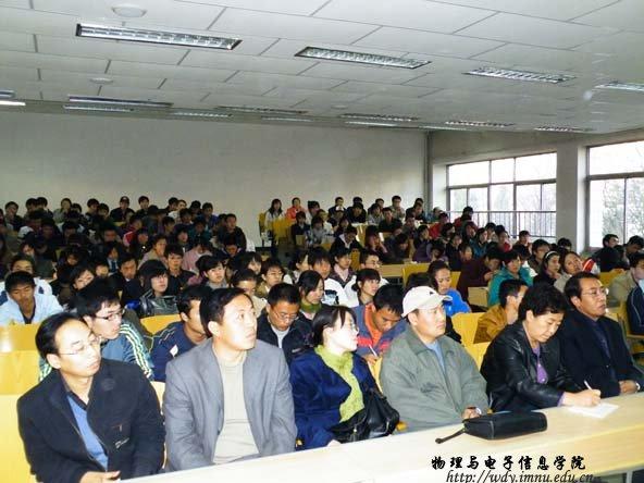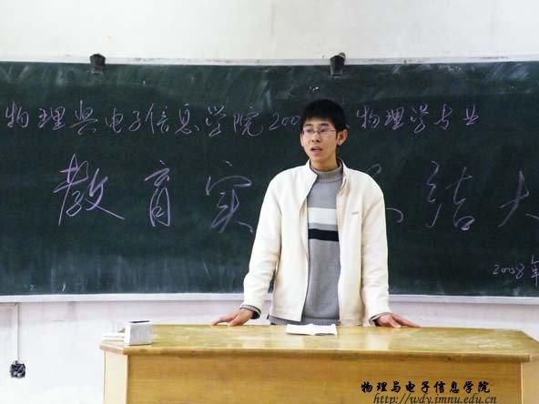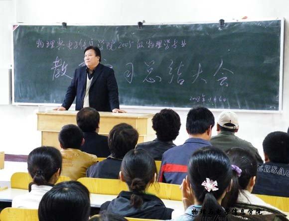 117下午1630,我院物理系05级学生的教育实习总结大会在信息楼三共举行。与会人员有阿梅书记,张伟院长,院长助理吉日嘎拉老师和张敏,曹永军等实习指导教师,以及物理系0506级蒙汉班学生,教室座无虚席。