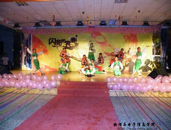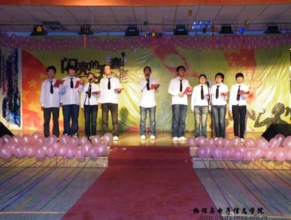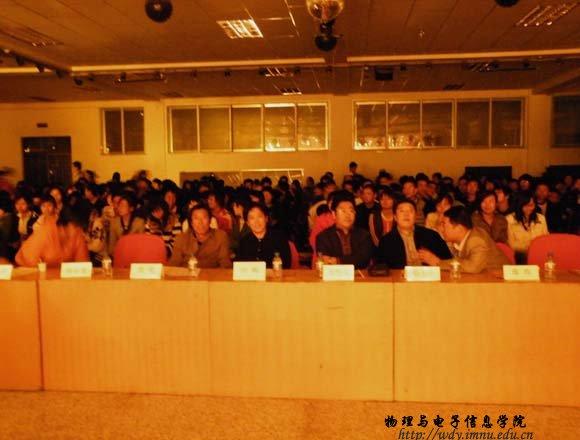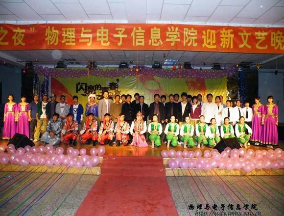 10月11日晚7点,我院精心筹备的以“闪亮的青春”为主题的“明亮之夜”物理与电子信息学院迎新晚会在学校餐厅三楼大学生活动中心隆重举行.学院党总支书记阿梅,学院党总支副书记兼副院长辛智俊,团总支书记何小龙,学工办副主任张伟以及08科技班班主任克伦、08汉班班主任孙咏萍出席了晚会现场,与08级新生共度了一个美好的夜晚。