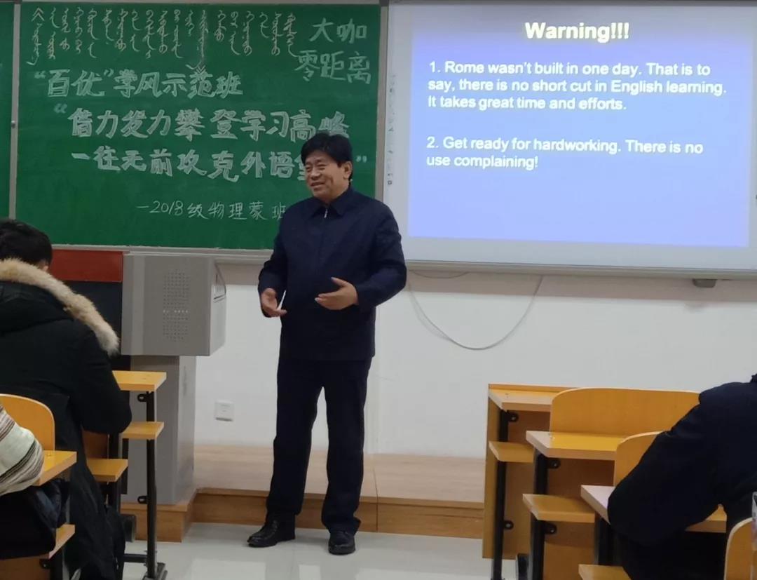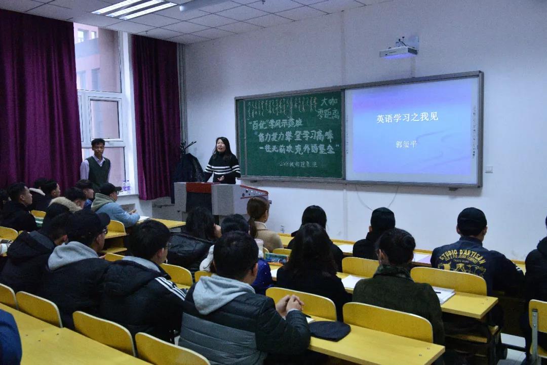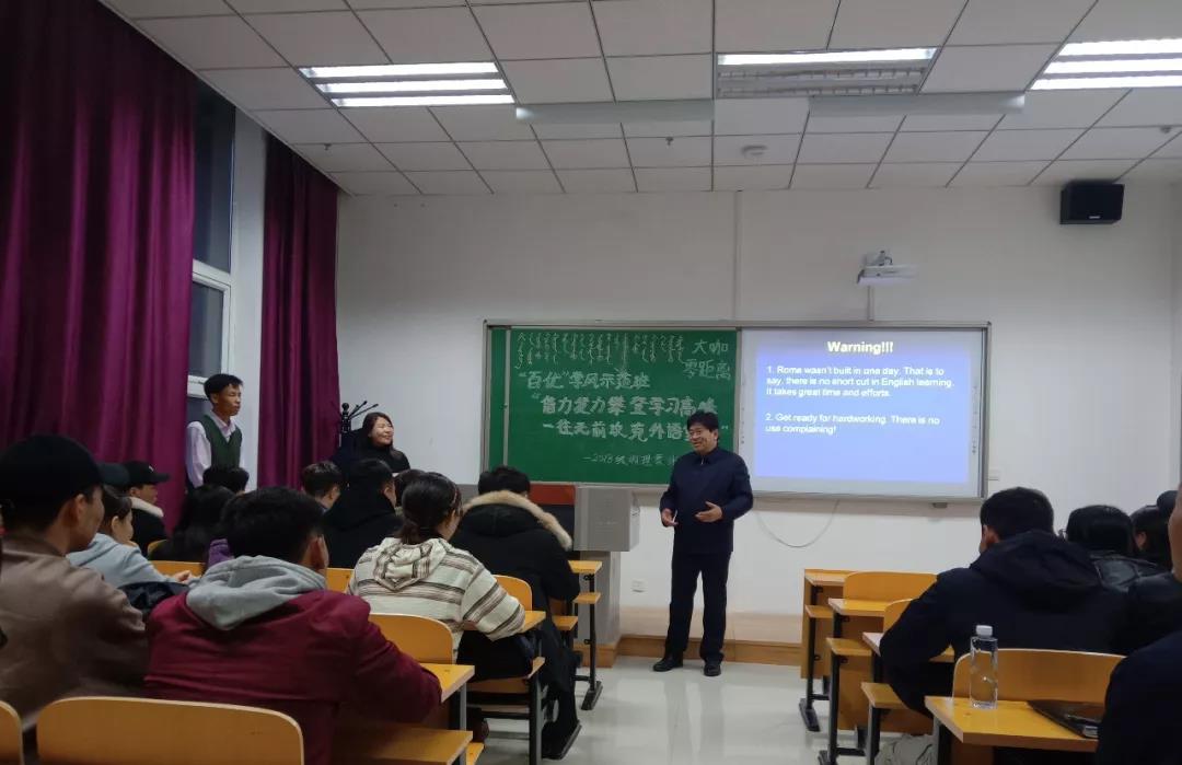 为进一步加强和培育班级优良学风建设,营造浓厚的学习氛围,共同培育团结和谐、健康向上的优良学风,激励学生刻苦学习,提升学习效率,11月28日下午,云国宏校长来到联系班级“百优学风示范班”物理与电子信息学院2018级物理蒙班,参加了该班“借力发力攀登学习高峰,一往无前攻克外语堡垒”主题集体学习英语班会,并与同学们进行了面对面交流。党政办、学生工作处及学院相关负责人陪同参加活动。本次活动特邀外国语学院郭玺平老师主讲,由2018级物理蒙班班主任伊博乐老师主持。