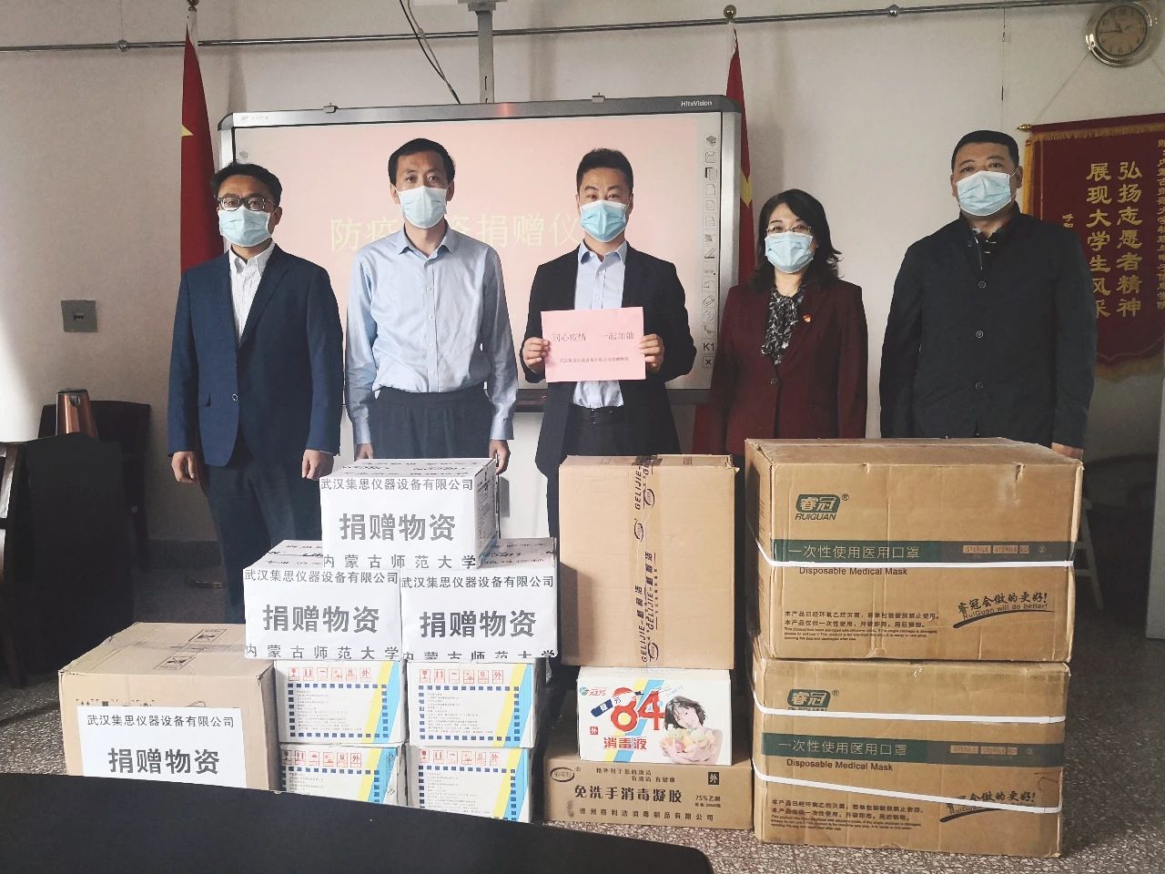 同舟共济抗击疫情,爱心捐赠暖人心。5月7日上午,内蒙古得世科技有限公司、内蒙古凯硕商贸有限公司和武汉集思仪器设备有限公司向我院捐赠一批防疫物资。捐赠仪式在物理楼会议室举行,我院党委书记刘美玲、副院长曹永军、党委副书记张伟、副院长那日苏以及办公室主任张天臣代表学院接受捐赠物资。