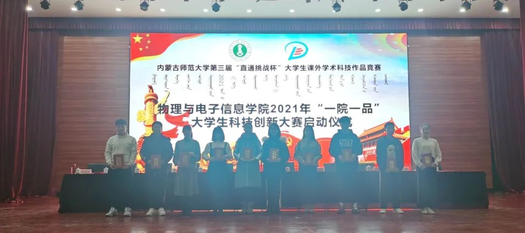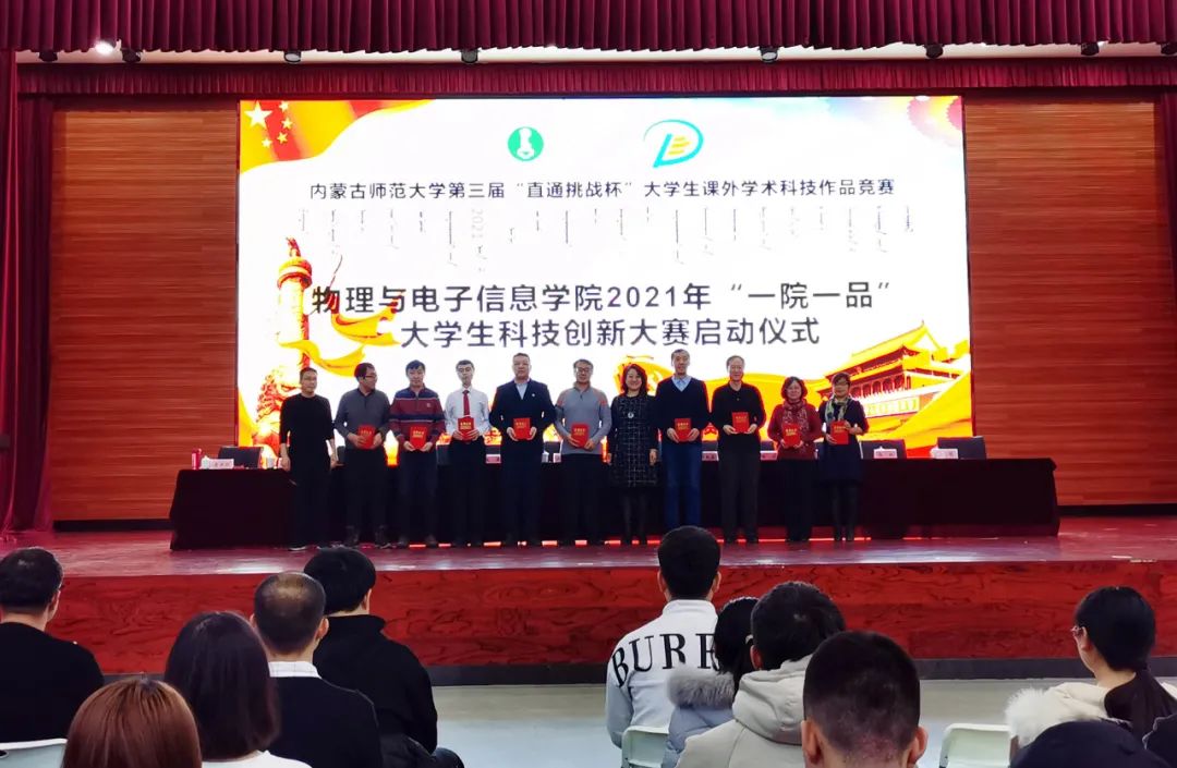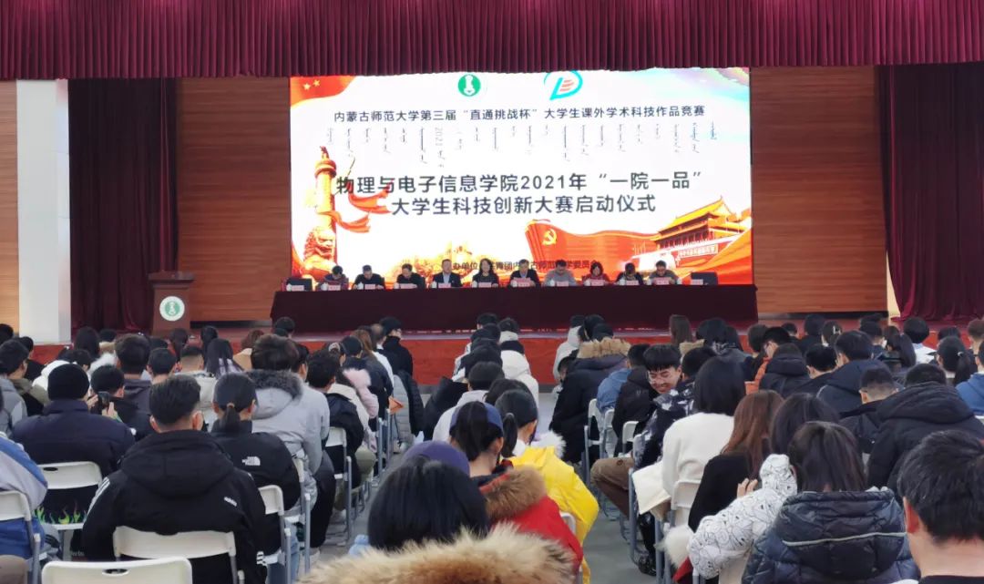 为引导和激励我院学生崇尚科学、追求真知、勤奋学习、锐意创新的精神,提高同学们的创新素质和实践能力,12月25日下午,我院在盛乐校区学生事务中心二楼多功能演播厅举办2021年“一院一品”大学生科技创新大赛启动仪式。本次活动由校团委主办,物理与电子信息学院团总支承办。学院党委书记刘美玲、副书记兼副院长曹永军、副书记兼副院长张伟、副院长那日苏、赵凤岐教授、材料系主任田晓、实践创新部主任梁学军、物理系副主任朝克夫、孙咏萍副教授、电子系信息处理教研室主任杨帆、19级汉二班班主任李喜彬等学院领导老师出席,20级全体研究生及本科生参加启动仪式。我院团总支负责人宝力尔主持会议。