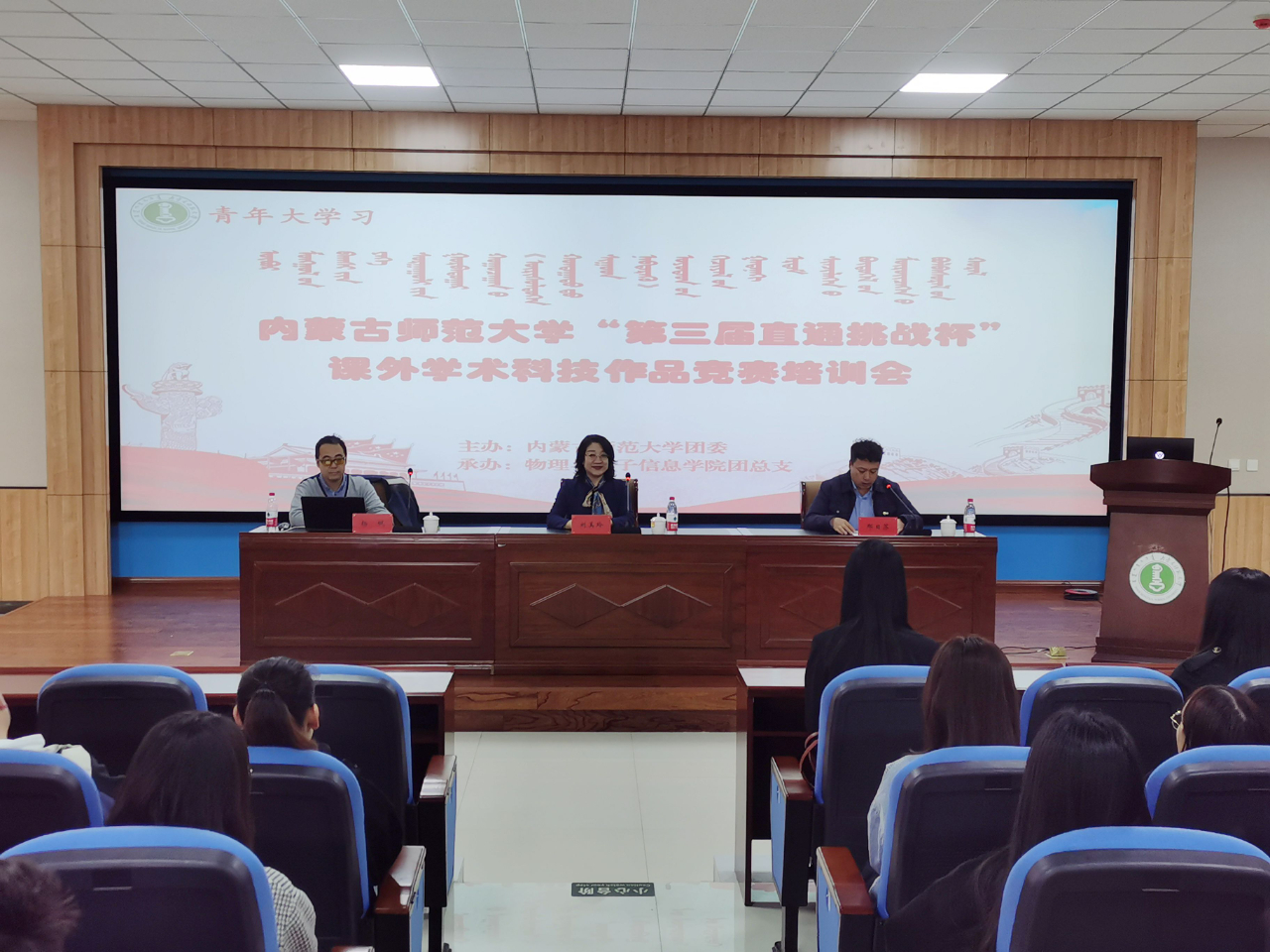为做好内蒙古师范大学第三届“直通挑战杯”课外学术科技作品竞赛的各项筹备工作,切实提升学生参赛作品的质量和水平,3月21日,由校团委主办、物理与电子信息学院团总支承办的内蒙古师范大学第三届“直通挑战杯”课外学术科技作品竞赛培训会在盛乐校区学生事务中心一楼举行。会议分别由校团委副书记包双成、校团委挂职副书记那日苏主持,北京林业大学校团委副书记、副研究员张骅、内蒙古民族文化产业研究院院长董杰、物电院杨帆副教授分别围绕“挑战杯”自然科学类学术论文、哲学社会科学类社会调查报告和学术论文、科技发明制作的竞赛作品提升做了主题培训,物理与电子信息学院党委书记刘美玲、校团委副书记包双成、 校团委挂职副书记那日苏出席,学院学就办副主任、团总支负责人、各学院挑战杯赛事负责人、本届赛事参赛选手、下届赛事意向参赛选手共600余人参加了宣讲会。