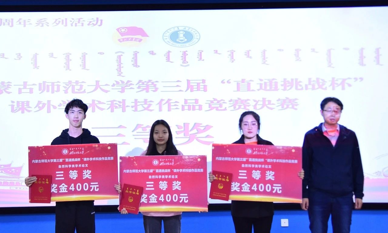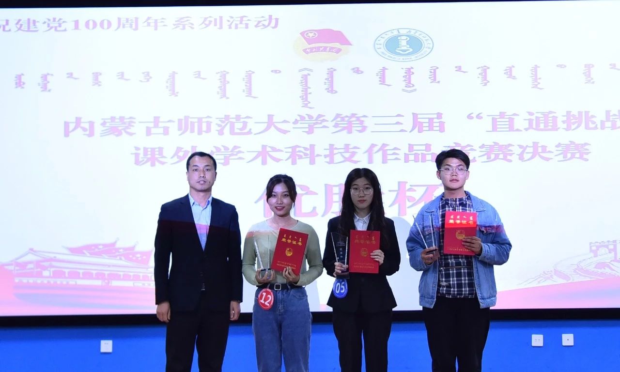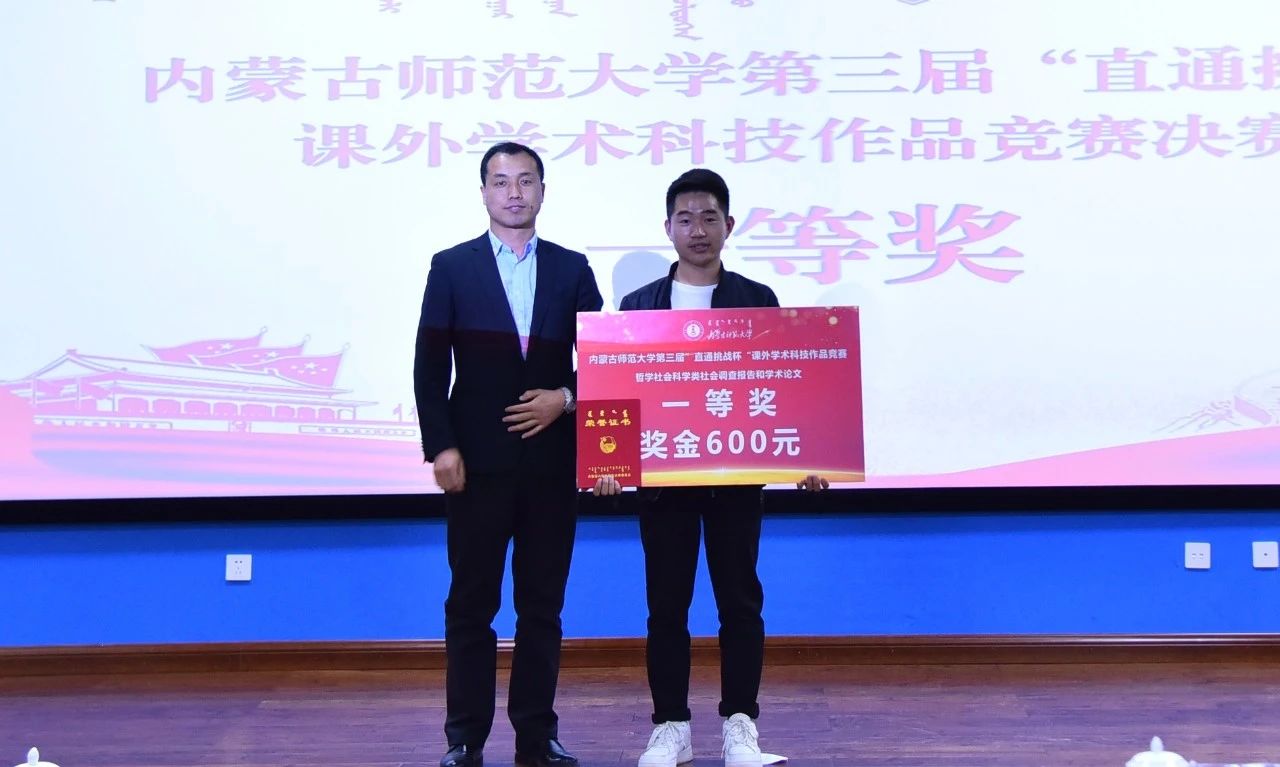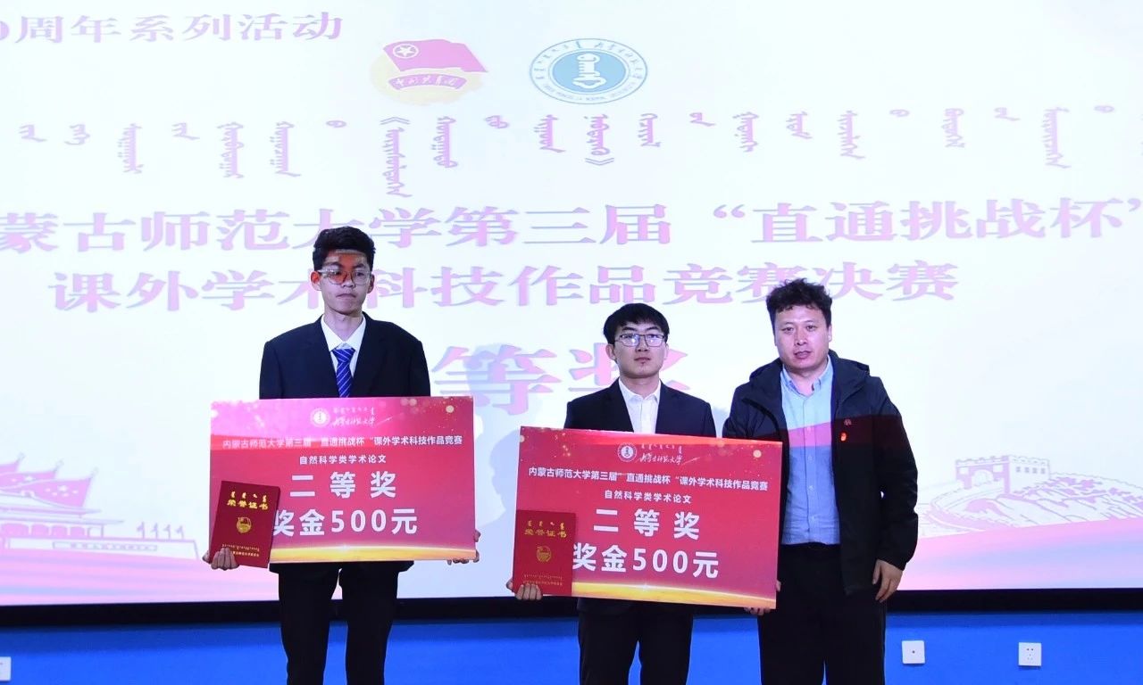 经评审委员会评审,物理与电子信息学院隋林泓等同学的“利用复式摆测量重力加速度及对摆的位形参数的测量”获得自然科技类学术论文作品一等奖,地理科学学院刘晶晶等同学的“增进民生福祉——征地补偿调查研究”获得哲学社会科学类社会调查报告和学术论文一等奖,计算机科学技术学院巴达日呼等同学的“物联网数据采集与监测云平台”获得科技发明制作类一等奖。