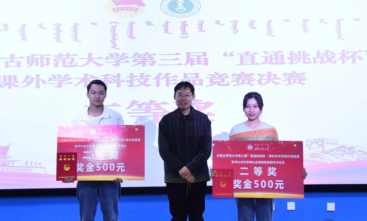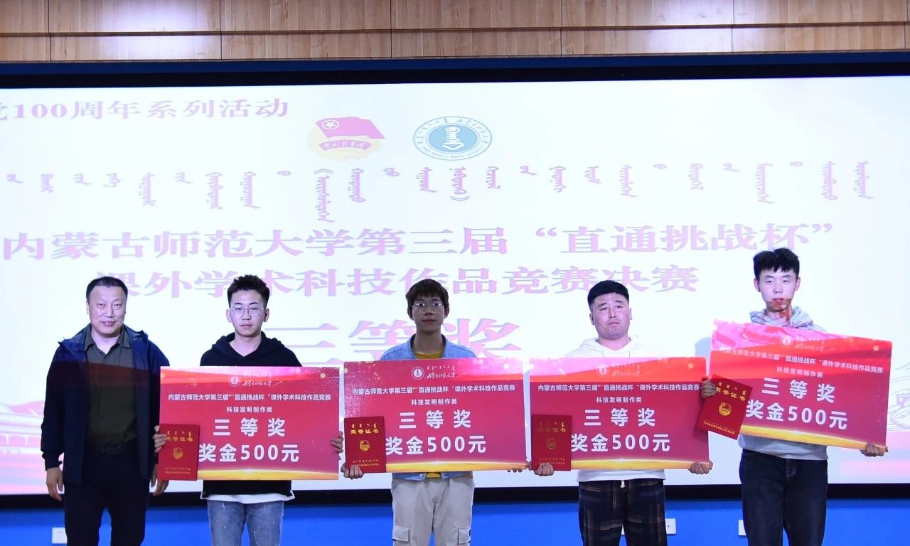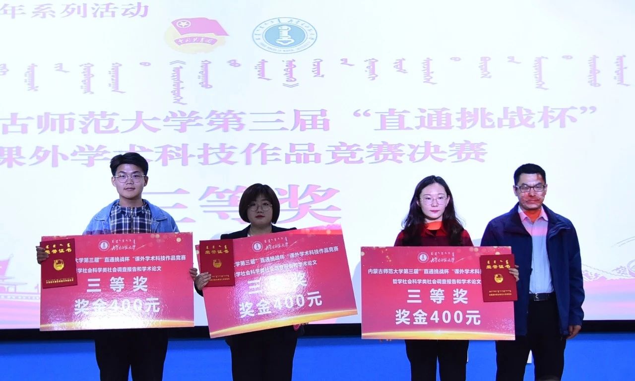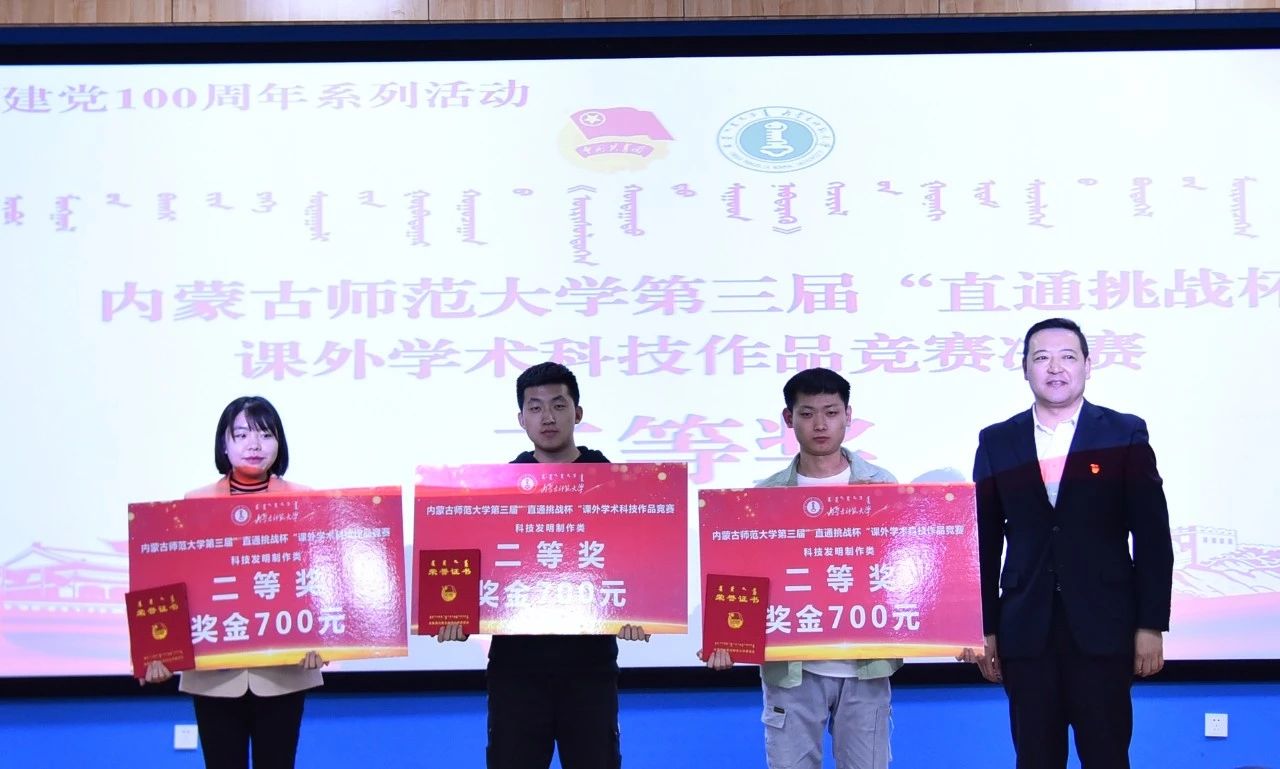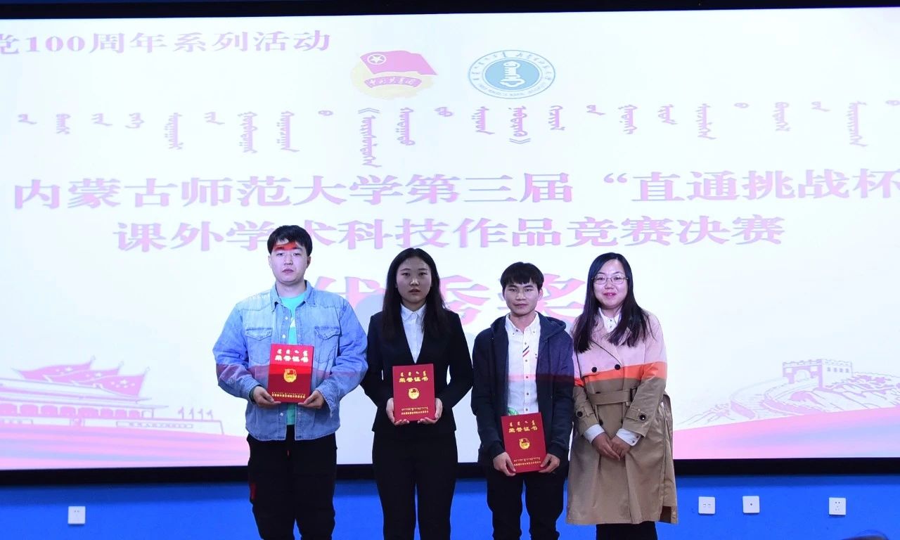 经评审委员会评审,物理与电子信息学院隋林泓等同学的“利用复式摆测量重力加速度及对摆的位形参数的测量”获得自然科技类学术论文作品一等奖,地理科学学院刘晶晶等同学的“增进民生福祉——征地补偿调查研究”获得哲学社会科学类社会调查报告和学术论文一等奖,计算机科学技术学院巴达日呼等同学的“物联网数据采集与监测云平台”获得科技发明制作类一等奖。