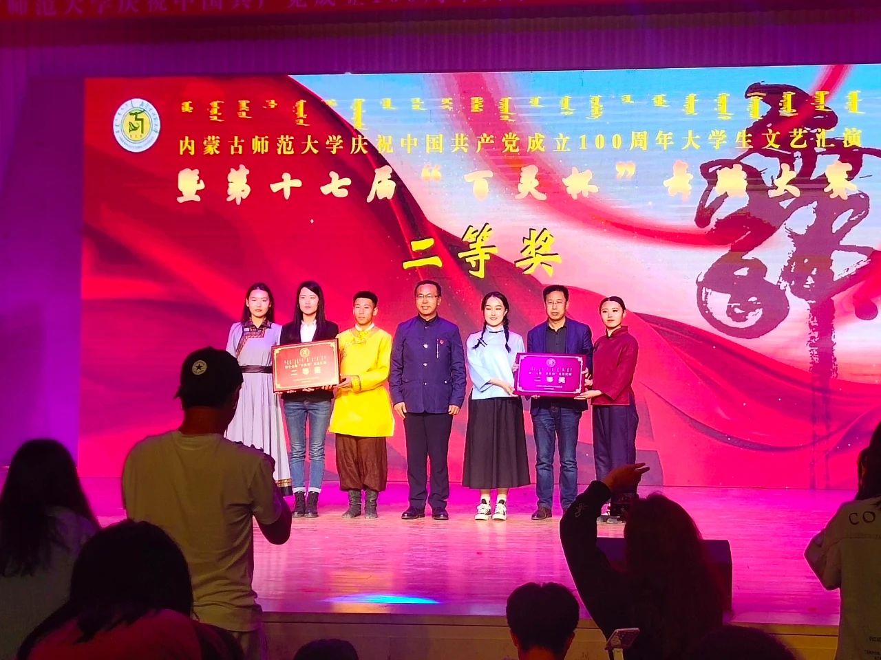 激动人心的颁奖仪式上,主持人宣布了获奖单位,我院演员代表上台接过第十七届“百灵杯”舞蹈大赛二等奖奖牌。取得这样的好成绩,是学院领导和指导老师高度重视、大力支持,也是演职人员夜以继日、刻苦准备的共同结果,再一次向全校展示出不懈钻研、不怕困难的“物电”精神!