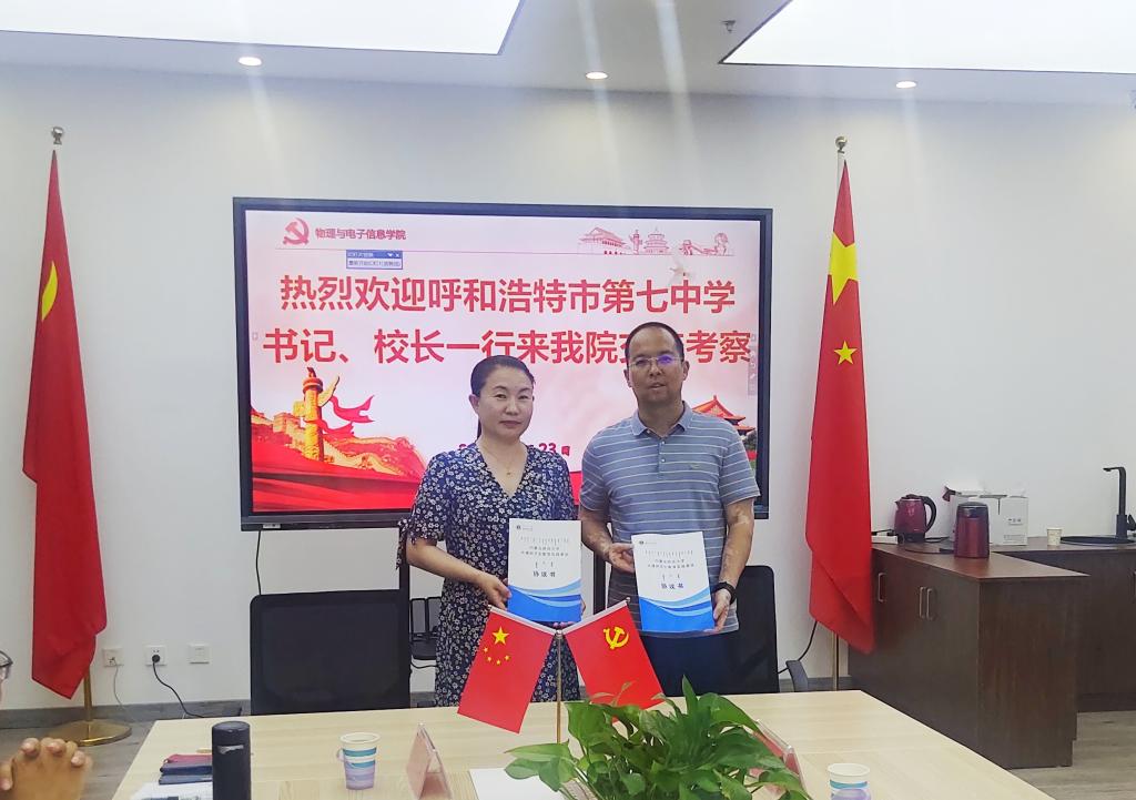 6月23日下午,呼和浩特市第七中学吴海鹰校长一行来我院交流考察。双方在物理与电子信息学院理工楼A701会议室举行座谈会。会议由我院那日苏副院长主持。曹永军副院长和吴海鹰校长分别介绍了各自单位的基本状况;物理系副主任孙咏萍老师就学院近年来汉生班教育实习情况做了汇报与说明;教务处实践科负责人毕力根格日勒老师参会指导工作,并与七中校长签署了“共建师范生教育实践实习基地协议”。