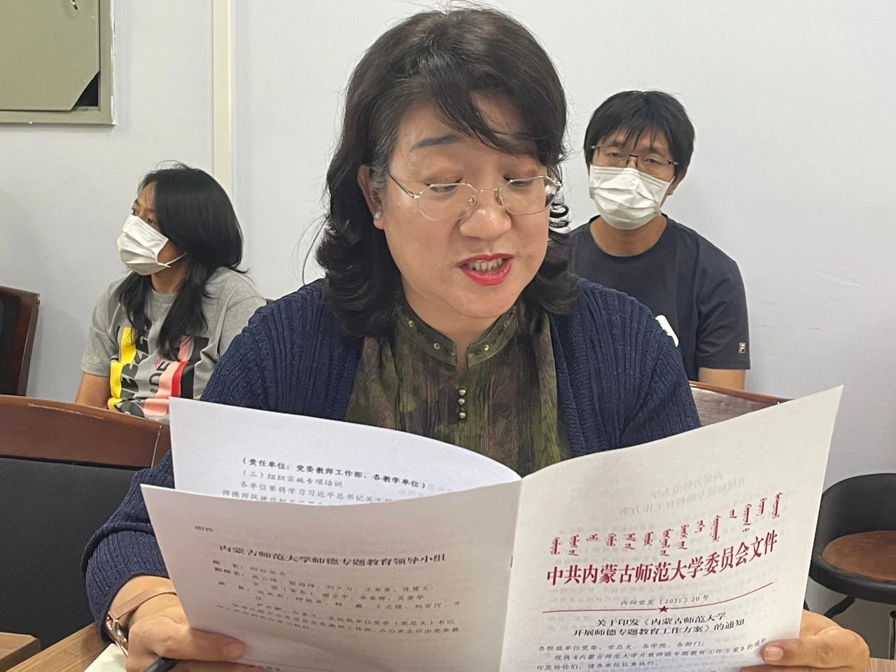 会议第二项,由我院党委书记刘美玲领学师德师风建设学习。刘书记从目标任务、总体要求、教育内容、工作安排及工作要求等方面传达《内蒙古师范大学开展师德专题教育工作方案》,之后对《内蒙古师范大学教师师德师风建设学习手册(第一版)》、《师德警示教育(一)——违反高校教师职业行为十项准则典型案例》进行领读学习。
