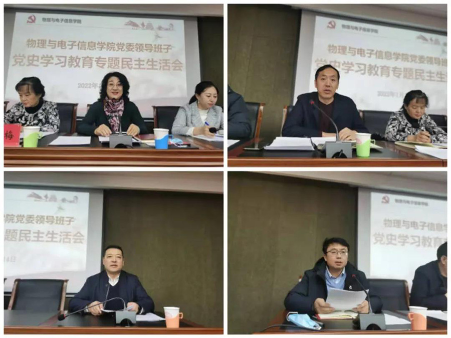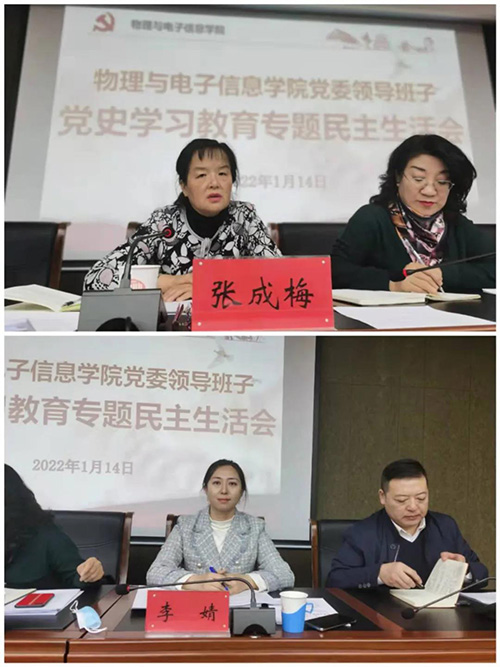 按照校党委部署和要求,经校党委党史学习教育巡回指导组审核批准,1月14日上午,物理与电子信息学院党委领导班子在赛罕校区文史楼1号会议室召开党史学习教育专题民主生活会。校党委党史学习教育巡回指导组张成梅、李婧到会指导。物理与电子信息学院党委书记刘美玲主持会议,学院党委领导班子全体成员参加会议。