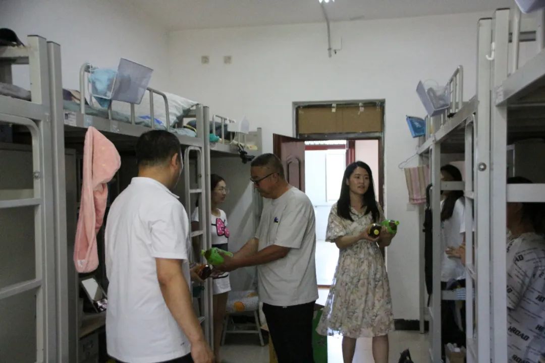 炎炎夏日送清凉,丝丝关心润心田。正值酷暑,物电院领导、老师十分牵挂在炎炎夏日中学习的学生,为充分了解学生返校后的学习与生活状况,鼓舞学生士气,8月5日,学院党委副书记兼副院长张伟、团总支副书记宝力尔、班主任代表2021级物理学蒙班班主任那日苏老师一行前往宿舍楼慰问我院在校学生。
