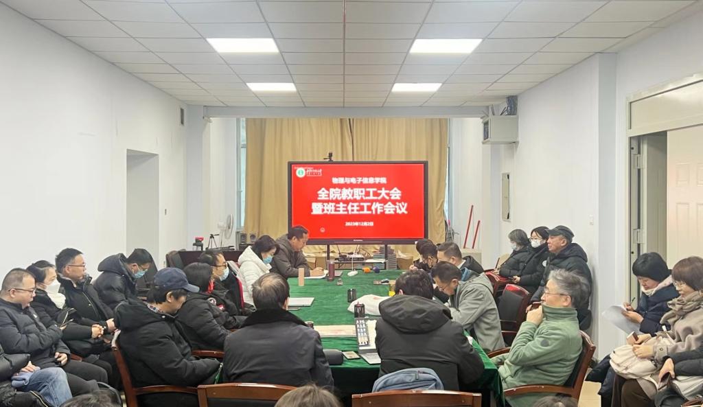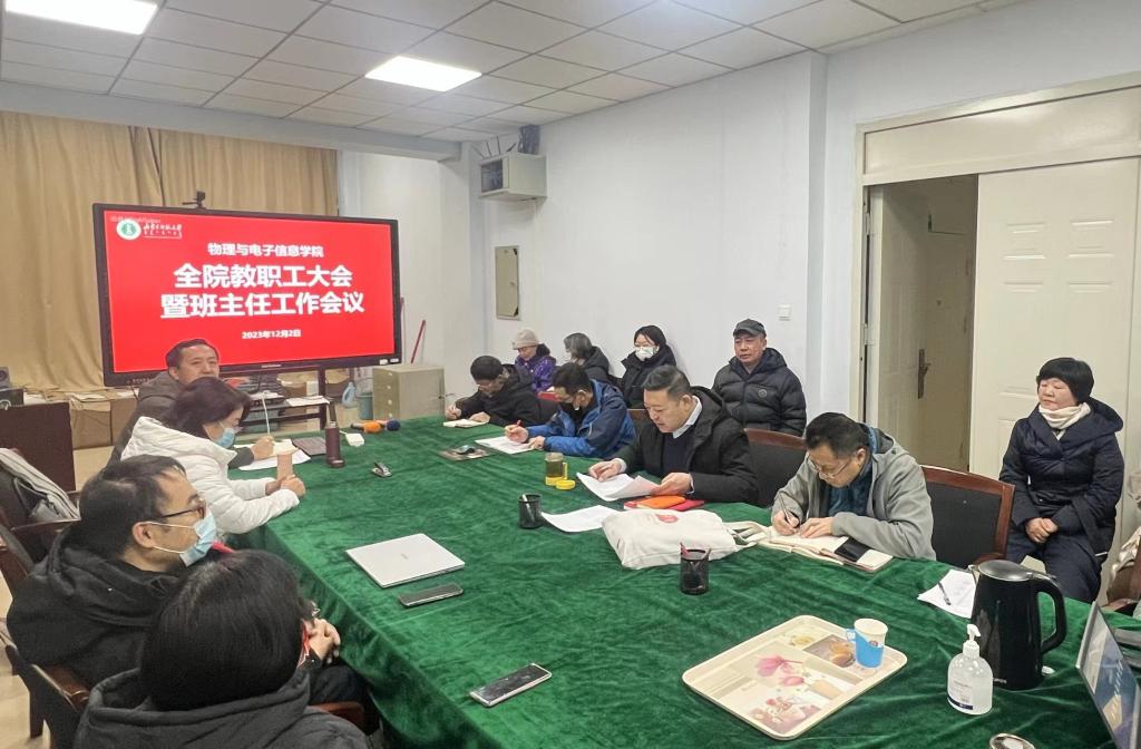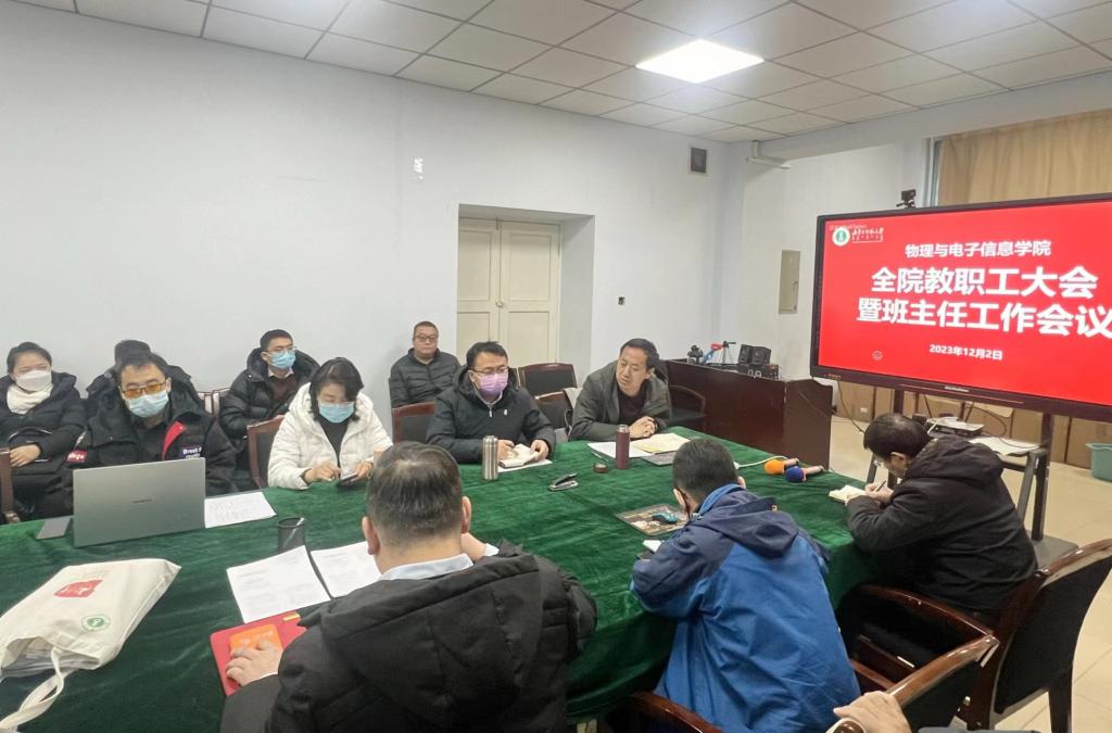 12月2日上午,学院召开全体教职工大会暨班主任工作会议,传达学习了自治区教育厅、学校相关文件和和会议精神,并结合学院实际对期末工作进行安排部署。物理与电子信息学院全体教职工和班主任参加,会议由学院党委书记张伟主持。
