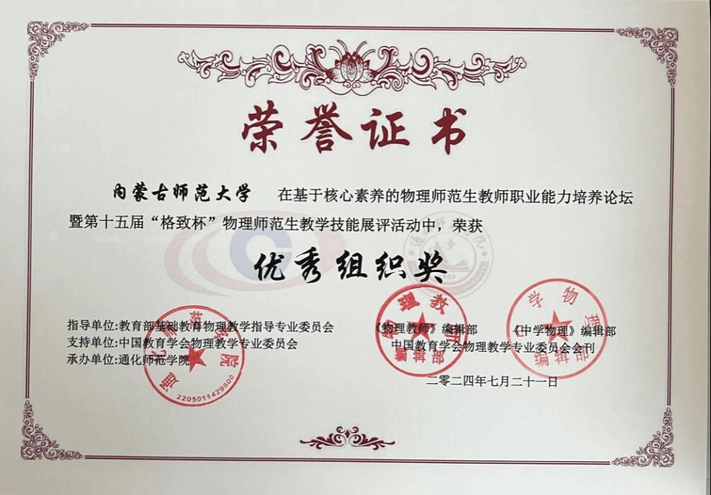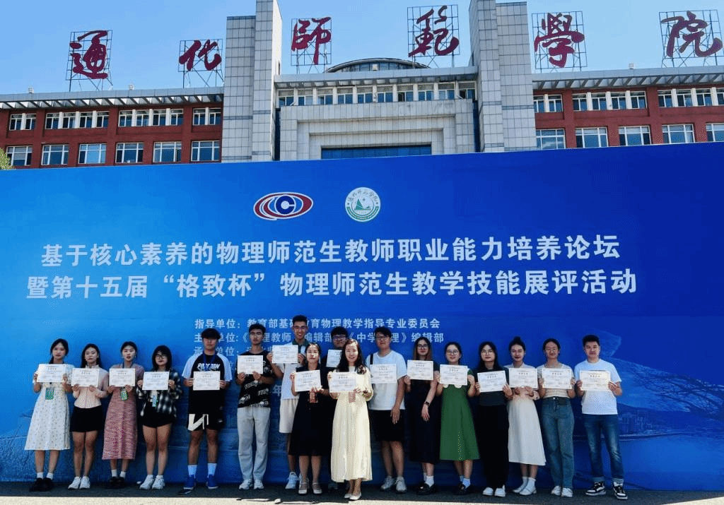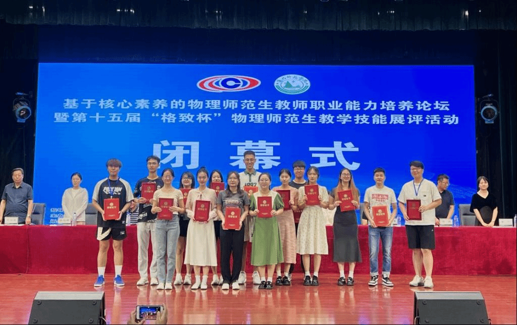 2024年7月19-21日,“基于核心素养的物理师范生教师职业能力培养论坛暨第十五届‘格致杯’物理师范生教学技能展评活动”在通化师范学院(吉林通化)举办。来自全国109所高校的教师学生参加了本次活动。我校张院生老师和萨其尔老师带队参加此次比赛。