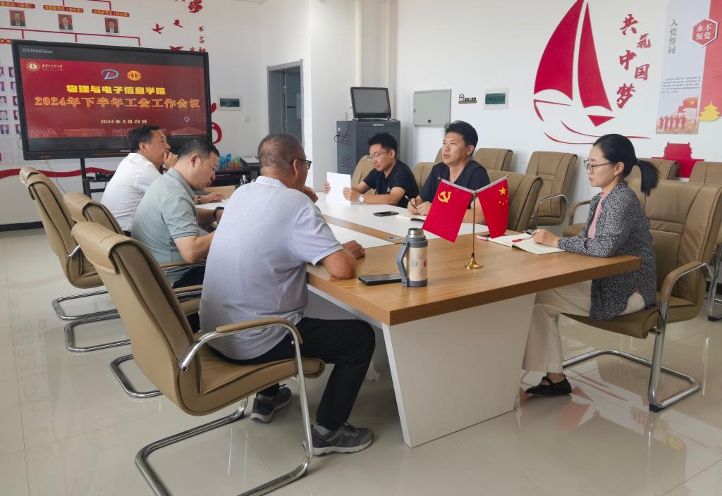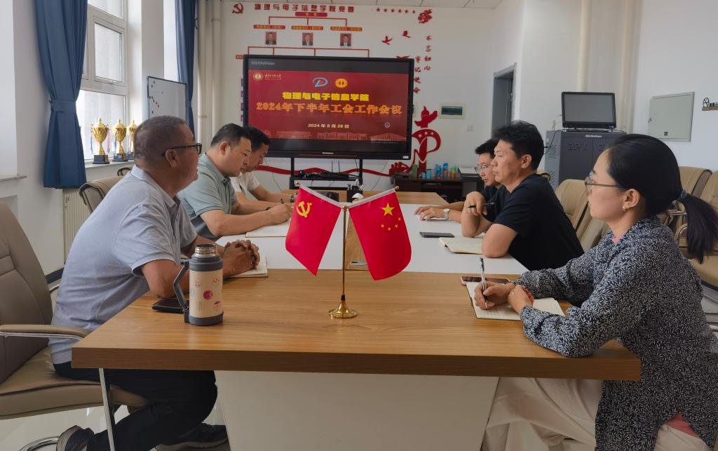 8月28日上午,物理与电子信息学院分工会在盛乐校区理工楼904B召开新学期第一次工会工作例会,学院党委书记张伟,副书记、院长曹永军到会指导,分工会全体委员参会。会议由学院分工会主席那日苏主持。本次会议旨在对新学期工会工作进行全面部署,并激励工会委员们更好的为广大教职员工服务,创造更好的工作和生活环境。
