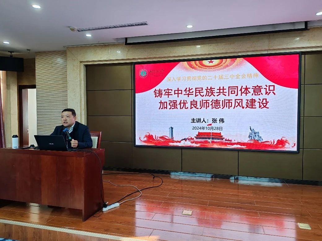 物理与电子信息学院党委书记张伟,以“铸牢中华民族共同体意识,加强优良师德师风建设”为题,围绕“统一思想认识,夯实铸牢中华民族共同体意识的思想基础;追寻总书记足迹,汇聚铸牢中华民族共同体意识磅礴伟力;加强师德师风建设,提升教师职业素养”三方面进行了深度讲解,引导学员们牢牢抓住铸牢中华民族共同体意识这条主线,深化民族团结进步教育。
