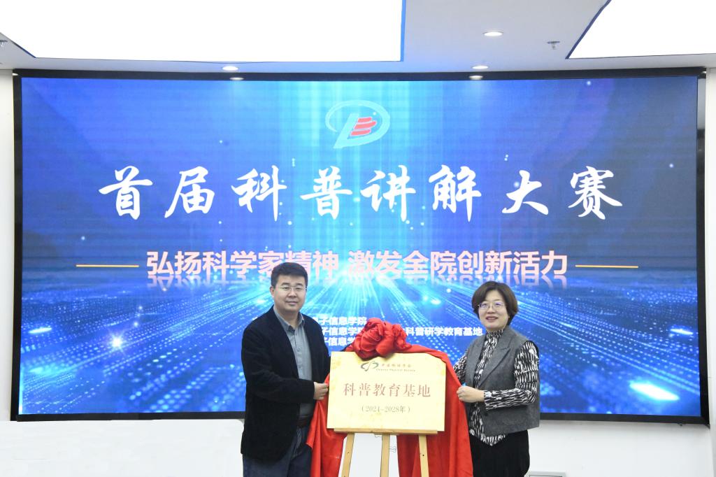 学校科研处副处长周丹丹、学院副院长包黎红共同为中国物理学会科普教育基地揭牌。