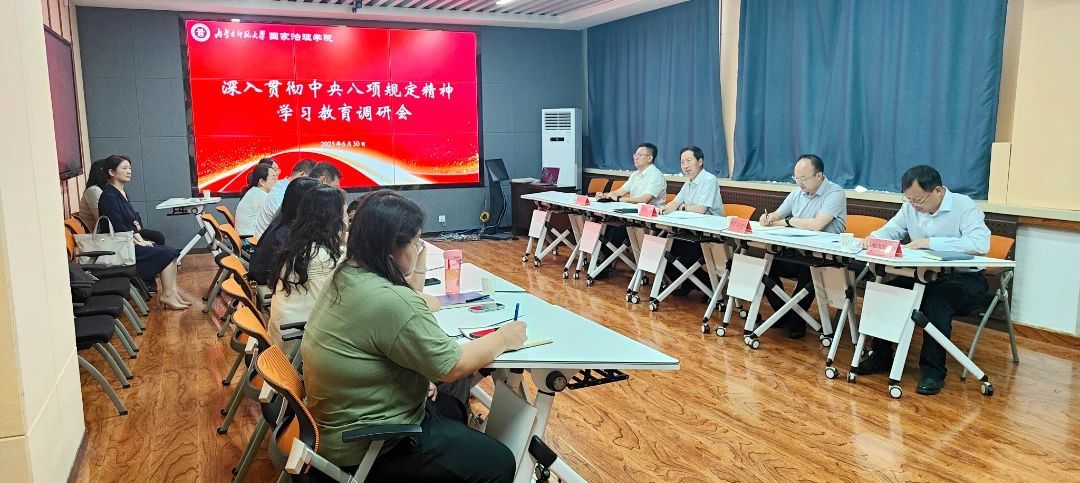 会上,国家治理学院、物理与电子信息学院有关负责同志就开展深入贯彻中央八项规定精神学习教育情况和学科建设、人才培养、师资队伍建设、科学研究等方面工作作了汇报。