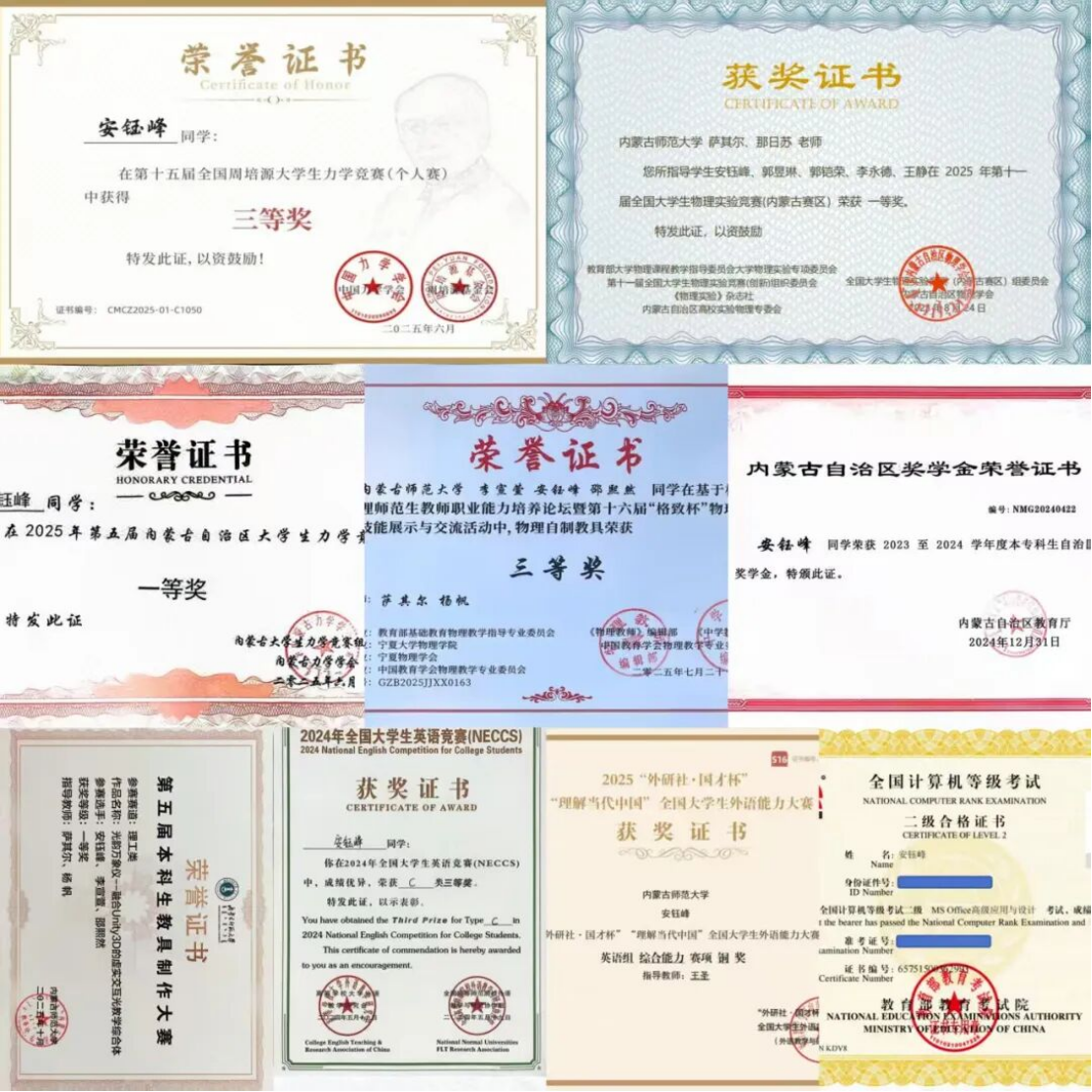 我是物理与电子信息学院2023级物理学三班的安钰峰,目前担任学院党员服务站站长和班级生活委员。在学习方面,我始终以勤勉专注的态度对待每一门课程,连续两年分别以90.73和92.77分位列专业第一。同时,我积极参与各类学科竞赛,并均已500+通过大学英语四六级考试,目前正参与基于Unity3D的虚拟仿真实验教学项目,致力于通过技术手段助力偏远地区物理实验教学;思想方面,我积极向党组织靠拢,同时通过参与青年大学习等活动,不断夯实理想信念;社会实践方面,我积极参与志愿服务,如迎新、社区清洁等活动,志愿北疆累计时长达142.6小时,到梦空间积分累计达493分。获国家奖学金后,我将继续深耕专业、服务社会,努力成为新时代优秀青年。