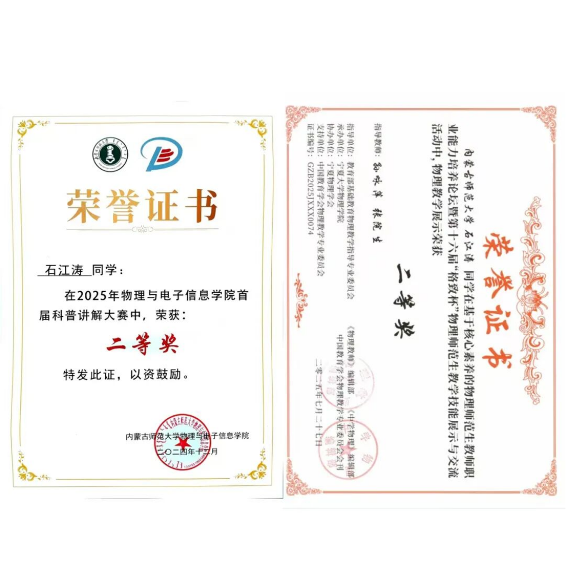 2024级学硕班 共青团员 获得2025年内蒙古自然科学学术年会物理分会暨内蒙古自治区物理学会年会优秀论文一等奖