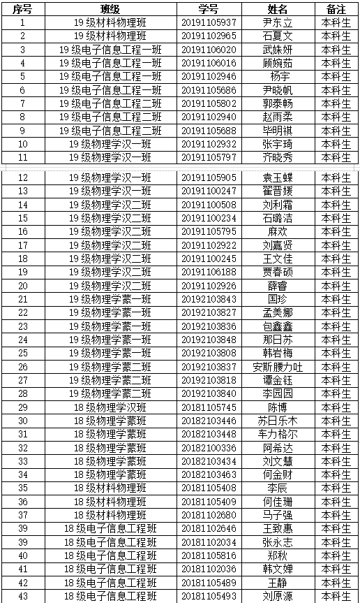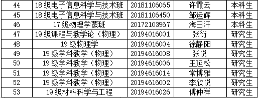 经物理与电子信息学院本科生支部、研究生支部支委会研究决定,同意以下(53位)同学为物理与电子信息学院第二十三期预备党员。根据党章及中国共产党发展党员工作细则的有关规定,现予以公示,接受党员群众监督。