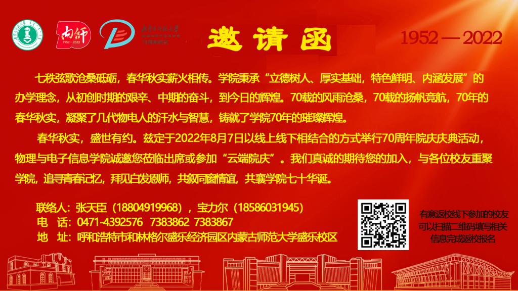 春华秋实,盛世有约。兹定于2022年8月7日以线上线下相结合的方式举行70周年院庆庆典活动,物理与电子信息学院诚邀您莅临出席或参加“云端院庆”。我们真诚的期待您的加入,与各位校友重聚学院,追寻青春记忆,拜见白发恩师,共叙同窗情谊,共襄学院七十华诞。