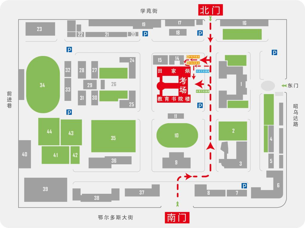 考生可按照红色路线的箭头提示自行选择由南门或北门进入田家炳教育书院楼考场。