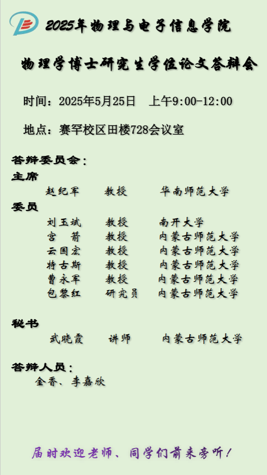 2025年物理与电子信息学院物理学博士研究生学位论文答辩会