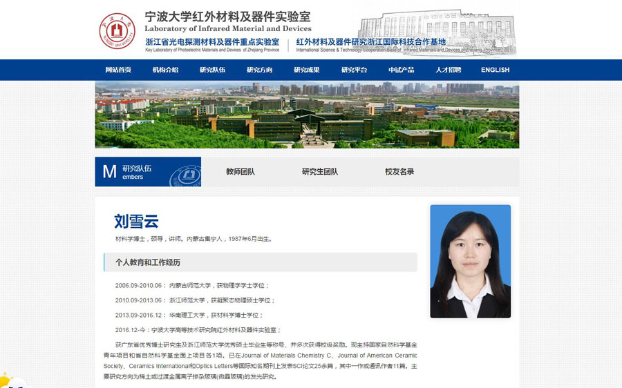刘雪云,材料学博士,硕导,中共党员,宁波大学高等技术研究院红外材料及器件实验室(http://www.ir-glass.com/index.php/archives/319/)讲师,内蒙古师范大学物理与电子信息学院2006级物理学汉班学生。曾获广东省优秀博士研究生及浙江师范大学优秀硕士毕业生等称号、并多次获得校级奖励。现主持国家自然科学基金青年项目和省自然科学基金面上项目各1项。已在Journal of Materials Chemistry C、Journal of American Ceramic Society、Ceramics International和Optics Letters等国际知名期刊上发表SCI论文25余篇,其中一作或通讯作者11篇。主要研究方向为稀土或过渡金属离子掺杂玻璃(微晶玻璃)的发光研究。