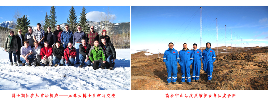 在硕士毕业后,怀揣着对极光的向往,勤奋好学的他于2012年底来到了世界最北的朗伊尔城小镇,在斯瓦尔巴德大学中心开始了他的博士生学习。这里紧邻我国北极黄河站约100公里。在这里学习和生活,不仅结识了他的博士导师和研究同事,更是让他在异国体验和收获到了许多特殊的感情和经历。在北极极端恶劣的自然条件下,不仅要照顾好自己的身心,更需要用心灵去体会人与自然的相互关系。在这里的野外,室外的体感温度冬天能达到零下40度;在伸手不见五指的极夜期间,即便北极熊通常在冬眠,但是在野外工作中,他和同事们仍然需要时刻保持警惕。他回忆说:“在这期间,我要感谢我所遇到的每一个人,是他们让我在世界的尽头有了非凡的体验。更要感谢我学习期间的导师,将我逐渐从一个科研‘小白’带到学术科研的道路上”。