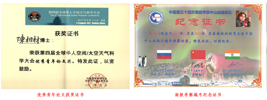 陈相材在物理与电子信息学院本科学习期间,曾任班级生活委员、班长等职,曾获内蒙古师范大学二等奖学金,“优秀共青团员”“学风建设标兵”等荣誉称号。他回忆说:“在大学的知识学习中,从学院老师的教学中,我感受到了每一位老师对于我们的包容与关怀,对于我们的鼓励与激励,对于我们知识点上遇到的困惑进行引导式的解答,更从学院老师严谨治学的态度中让我逐渐感受到了科学研究的魅力。”2006年10月,内蒙古师范大学物理与电子信息学院与中国极地研究中心高空大气物理研究室签署了联合培养研究生的协议,物理与电子信息学院招收的理论物理与光学专业硕士研究生,符合中国极地研究中心高空大气物理研究室认同条件,由中国极地研究中心与内蒙古师范大学联合培养。2010年,读研二的他从光学专业跨度到了空间物理专业。对他来说,这是一个全新的研究领域,主要探究的是从太阳到地球上层大气所关联的空间物理现象及空间天气变化过程的研究。这一切,都要基于大学期间所学到的基本物理学知识。