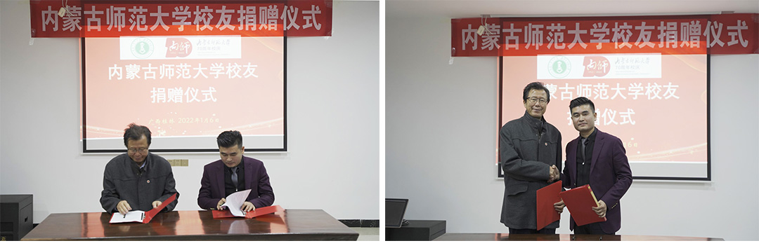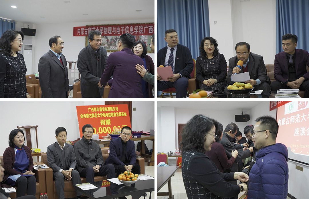 1月6日,内蒙古师范大学七十周年校庆捐赠仪式暨广西校友座谈会在广西春丰誉实业有限公司举行。我校党政办主任、校庆办公室常务副主任特格希,教育发展基金会理事长梁栋才,校友会秘书长高娃,物理与电子信息学院党委书记刘美玲,学院办公室主任张天臣等出席仪式,桂林市教育局教研室主任王峰研究员,广西桂林觅源纪食品有限公司总经理陶文博,广西春丰誉实业有限公司董事长王春以及我校在桂工作的校友代表20余人参加,物理与电子信息学院党委副书记、副院长张伟主持仪式。