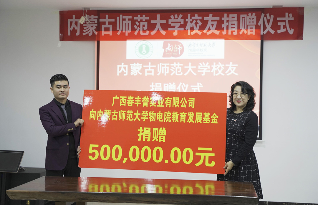 为庆祝母校70华诞,我校物理与电子信息学院2005级校友、青年企业家、广西春丰誉实业有限公司董事长王春先生,怀着浓情捐资捐物50万元,在内蒙古师范大学教育发展基金会设立物理与电子信息学院教育发展基金,助力学校、学院师生教育、就业创业、校友事业、基本建设和相关性的学校教育发展。公司将在三年内向该专项基金账户捐赠价值50万元的款项或实物。这既是对母校70华诞的美好祝福,更是对学校、学院发展建设的有力支持。