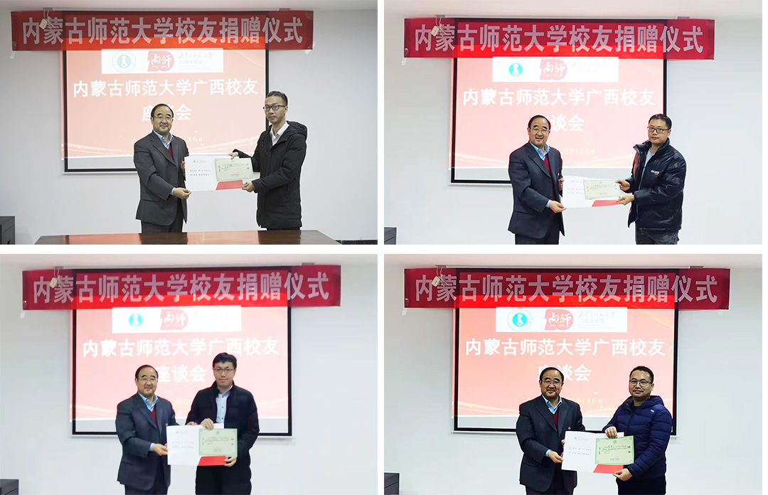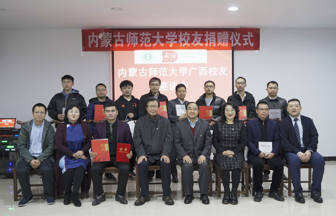最后,全体老师为校友佩戴内蒙古师范大学校徽,为广西校友颁发了校友联络证书和纪念品,合影留念。